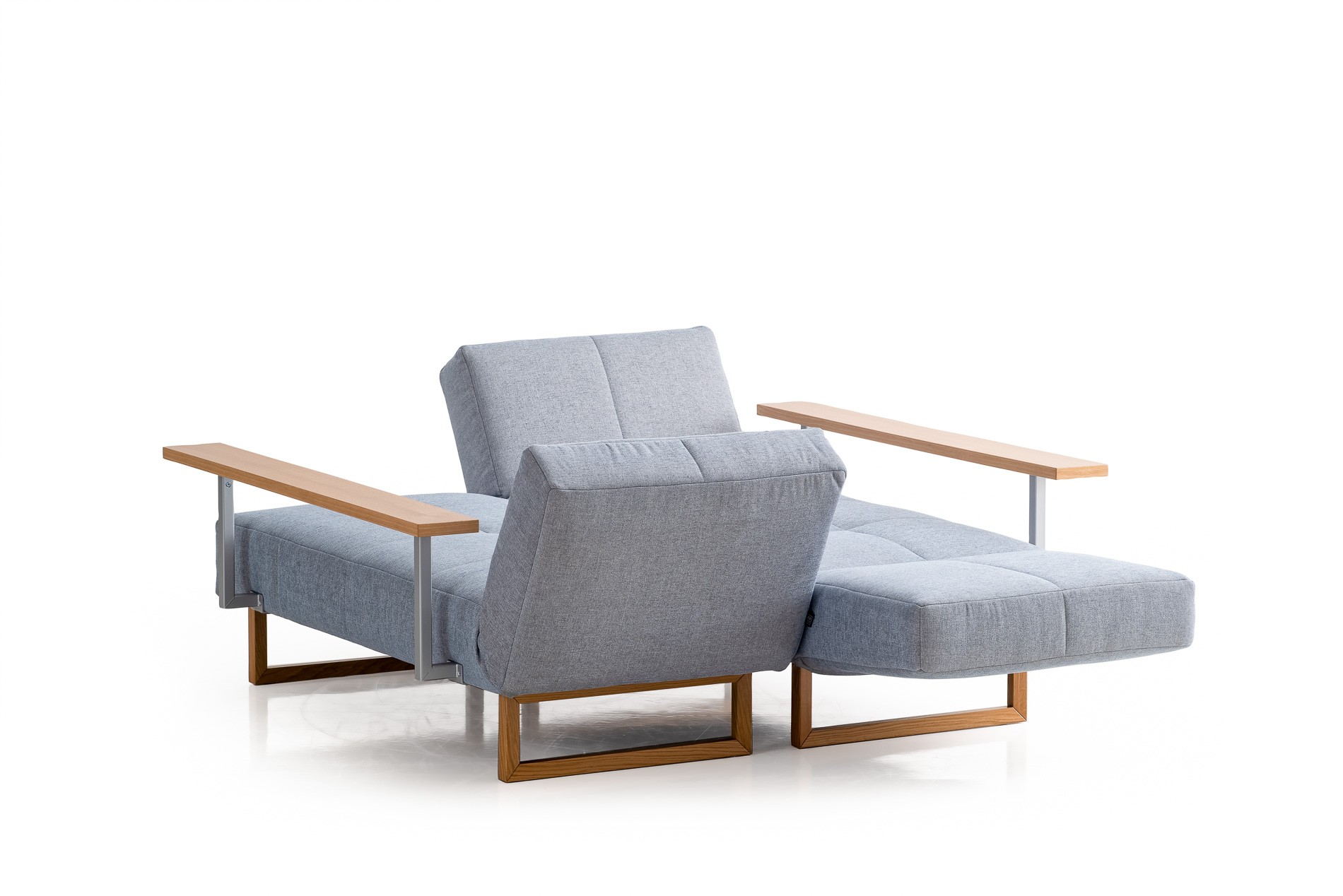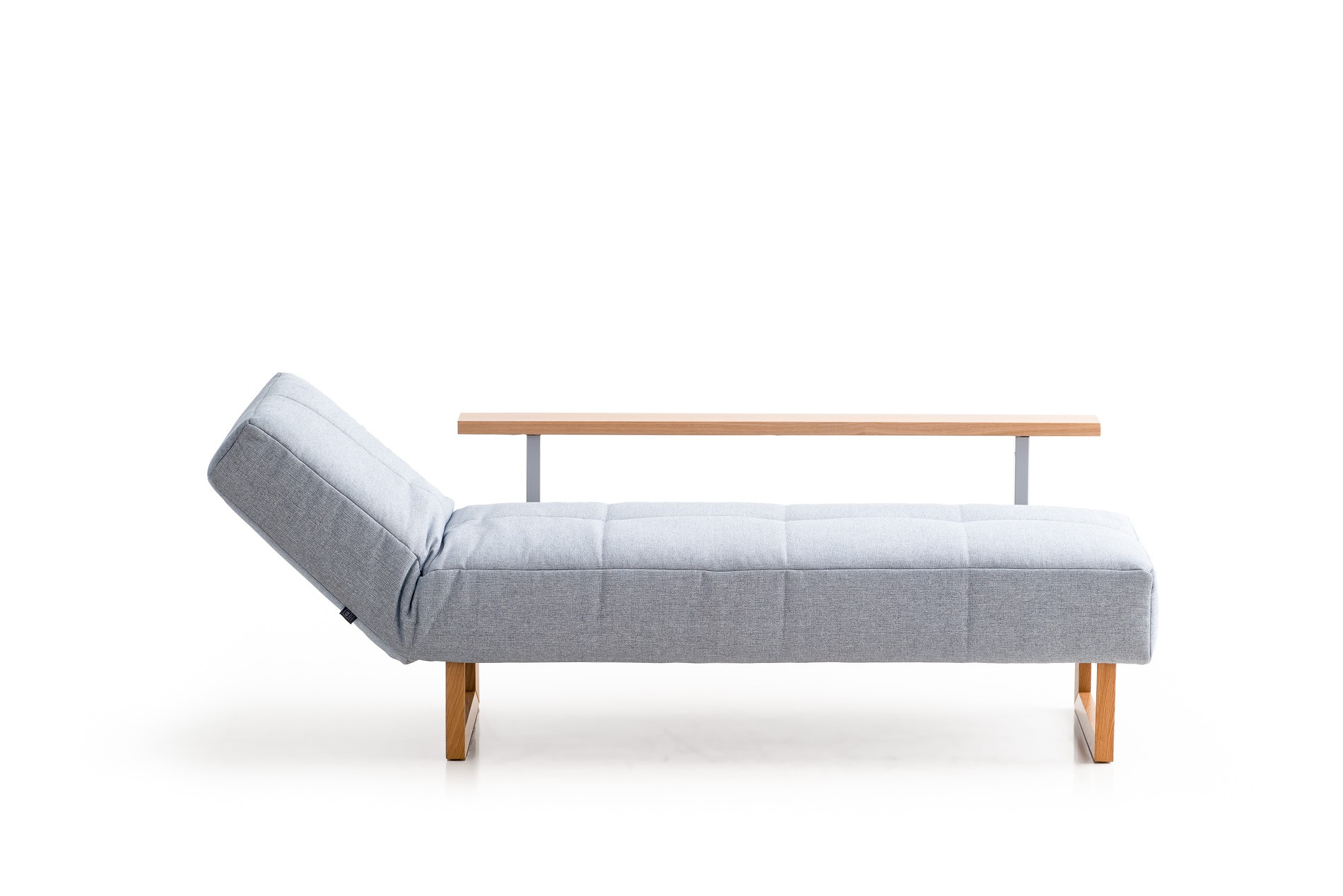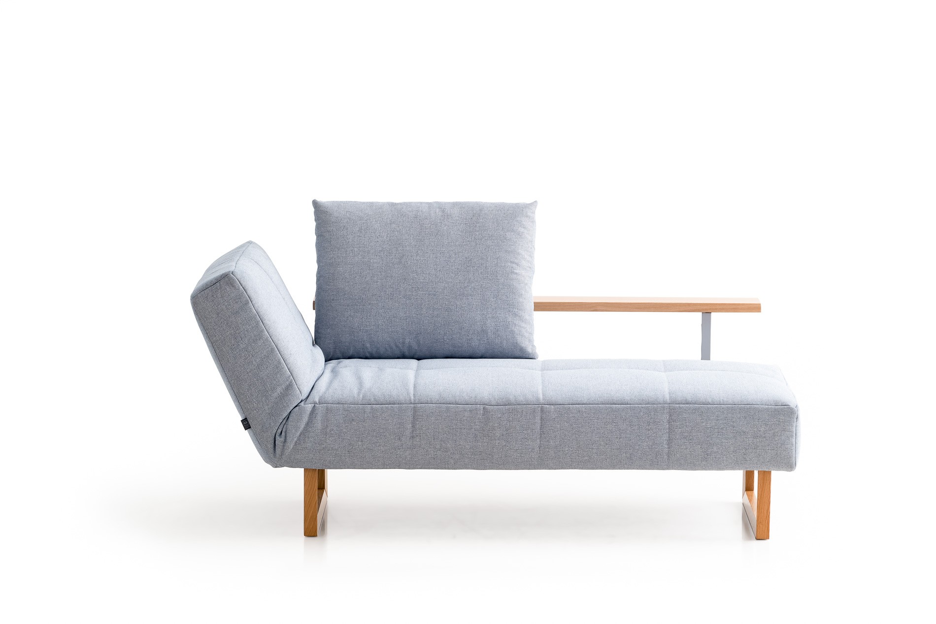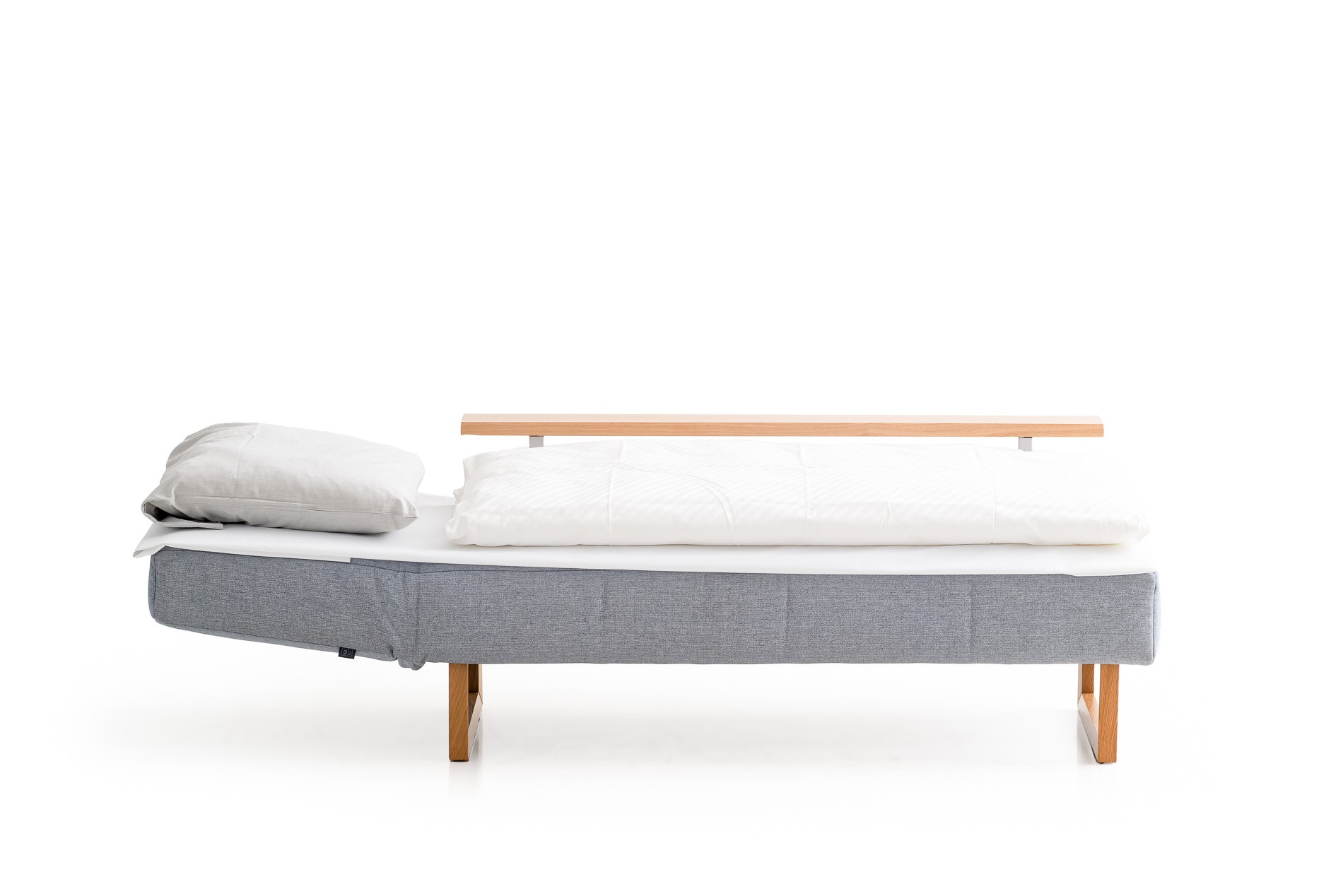 Einzelliege inkl. Rücken und 2 Rückenkissen. Kufen aus Buchenholz gebeizt oder decklackiert. Hier im Webshop in der Stoffausführung. Auf Anfrage fertigen wir die Sofa-Liege auch in Leder.