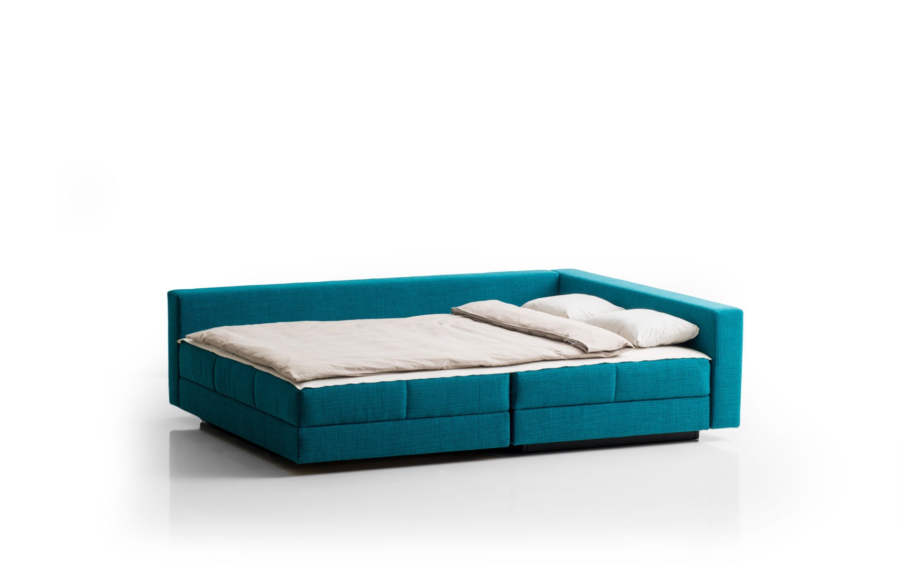 Das schwenkbare Sitzelement kann über einen Drehbeschlag an das feste Sitzelement herangeschwenkt und an diesem fixiert werden. Im festen Sitzelement ist ein Bettkasten integriert. Der Obersitz des festen Sitzelementes kann über Gasfedernbeschläge geöffnet werden.