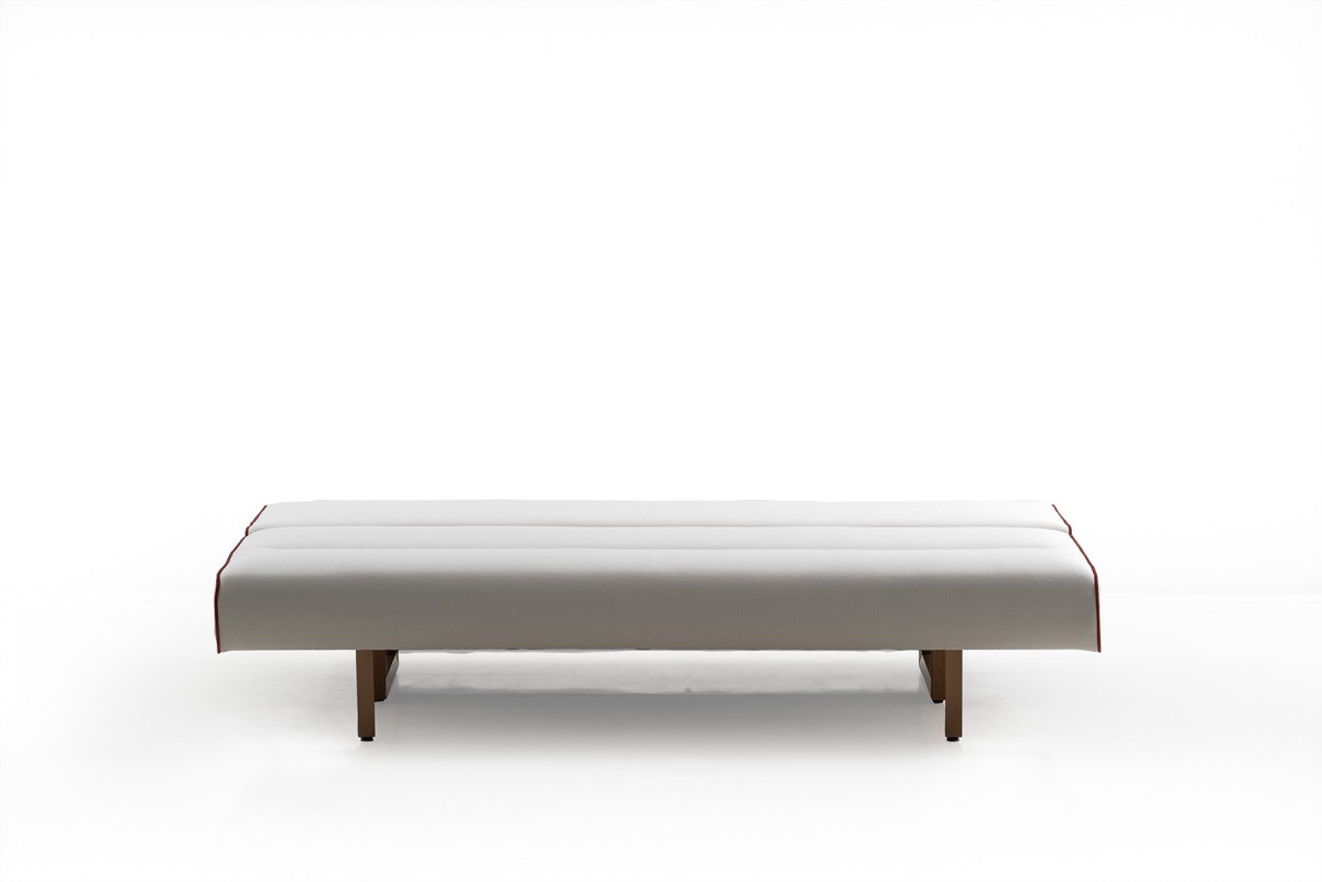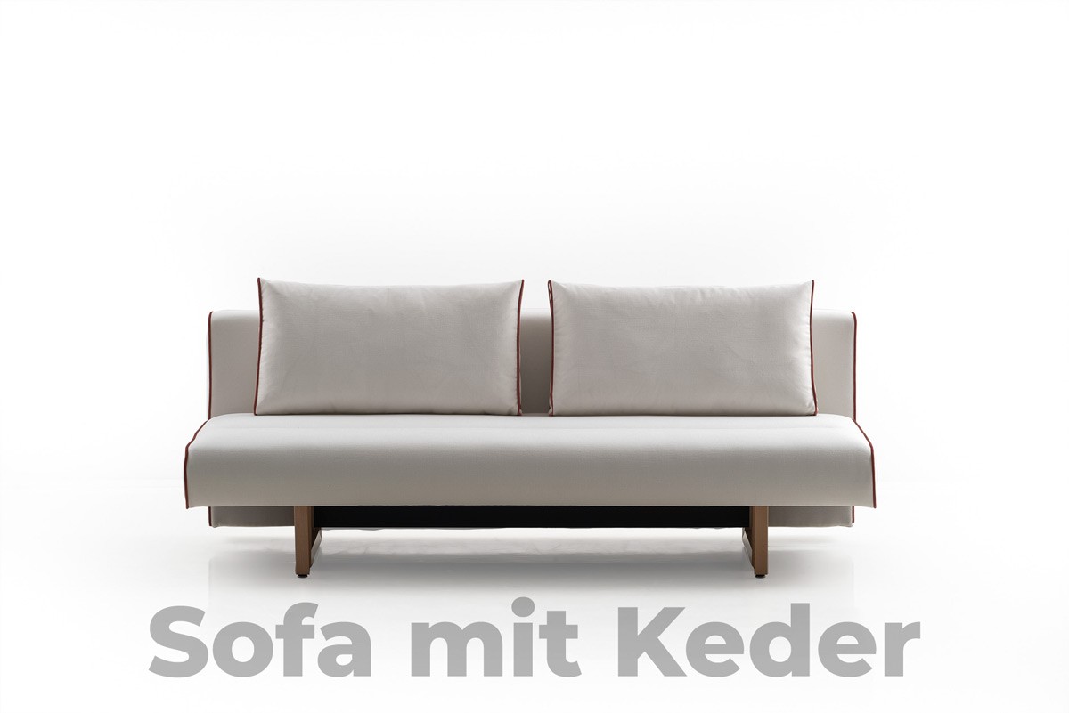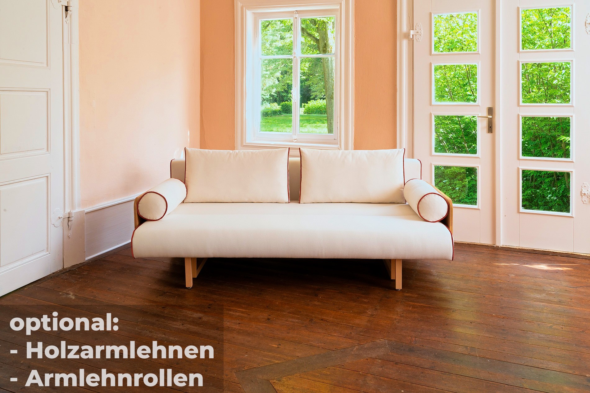 Querschläfer-Sofa abgesteppt oder mit Keder inkl. 2 Rückenkissen. Hier im Webshop in der Stoffausführung.