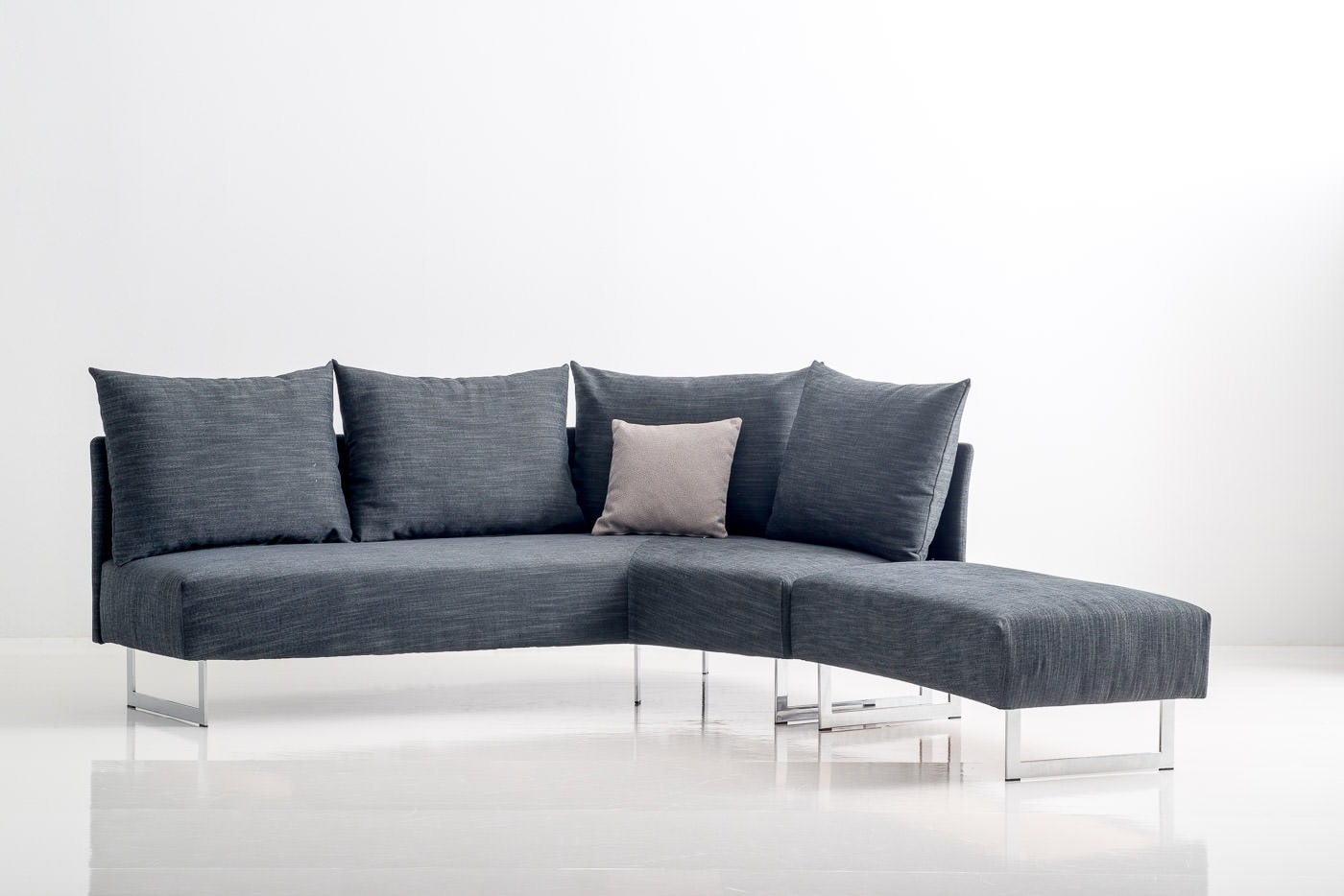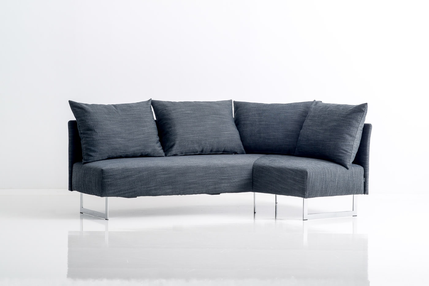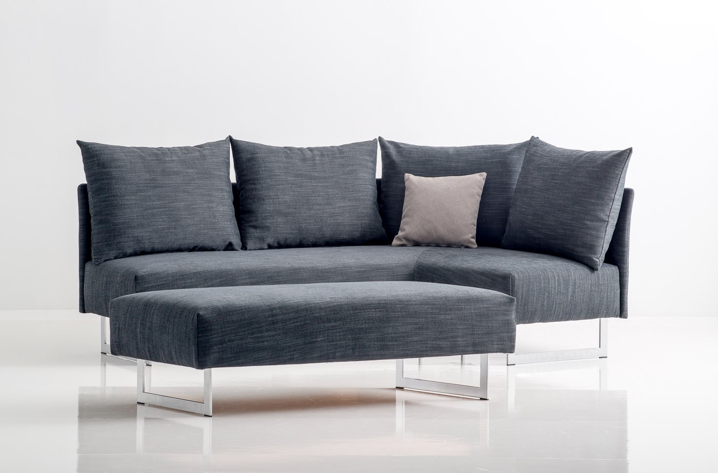 Das Winkelsofa aus dem Programm TAIPEI bietet auf einer minimalen Fläche von 145 x 200cm alle Annehmlichkeiten eines Ecksofas. Ein idealer Begleiter zum Sofa ist der Hocker, der in der Verlängerung der Sitzfläche platziert eine zusätzliche Sitzmöglichkeit schafft oder eingeschoben in die passende Aussparung des Sofas die Sitzfläche zu einer Liegefläche mit den Maßen 140 x 200cm erweitert. Die Polsterung aus Federkern und einer soften Schaumauflage schaffen einen angenehm weichen, legeren Sitz – und Liegekomfort. Der grazile Rücken und die Holzfüsse in runder oder konischer Form sorgen für eine leichte, fast schwebende Optik. Optional sind anstelle der Füße auch hochglanz-verchromte Kufen lieferbar. Den Hocker gibt es ohne oder mit Stauraum, und er kann mit dem passenden Tablett zusätzlich als Ablagetisch genutzt werden.