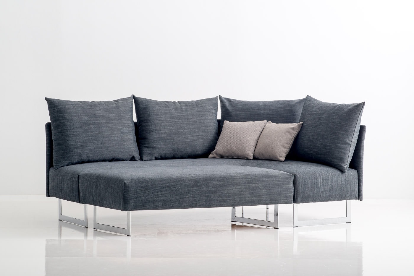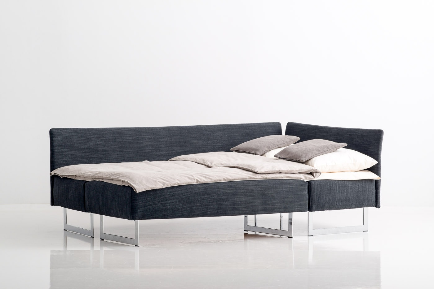Durch die Kombination des Winkel-Sofas mit einem Hocker ergibt sich eine Relax- bzw. Schlaffläche von 140 x 200cm. Die Liegefläche ergibt sich durch das Anstellen des Hockers in die entsprechende Aussparung des Winkel-Sofas, beide Elemente lassen sich durch Verbindungsbeschläge, die an der Unterseite des Winkel-Sofas bzw. des Hockers montiert sind, fixieren.