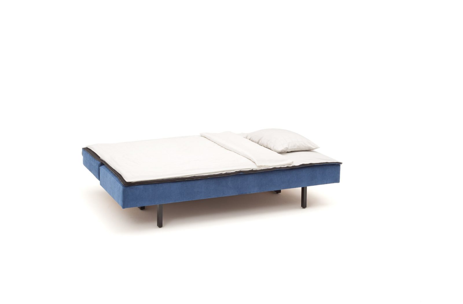 Der Sitz kann nach vorne gezogen und der Rücken zur Komplettierung der Liegefl äche nach vorne umgeklappt werden. Am Rücken des Sofas ist eine Decke angebracht (Topper), die in der Schlafposition zur Schonung des Sitzbezuges und zur Erhöhung des Schlafkomforts nach vorne umgeschlagen werden kann. Der obere Teil des Kissens läßt sich über Rasterbeschläge nach oben klappen.